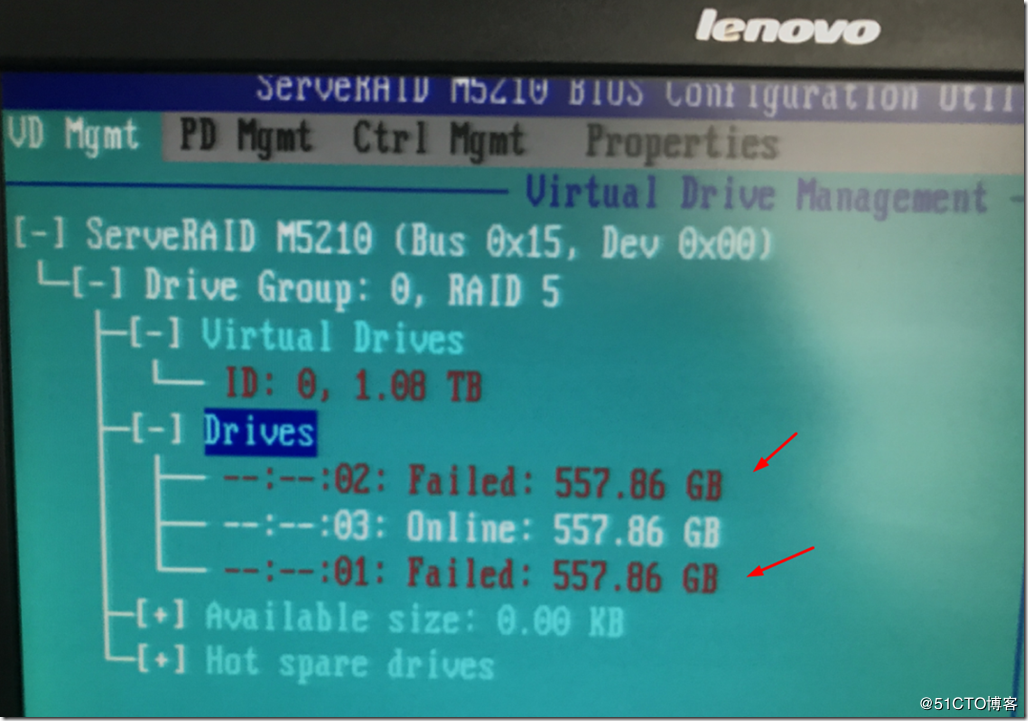图1中坏2块硬盘的服务器,打开电源进入RAID界面,看到01、02槽位的硬盘为Failed状态,如图3所示。