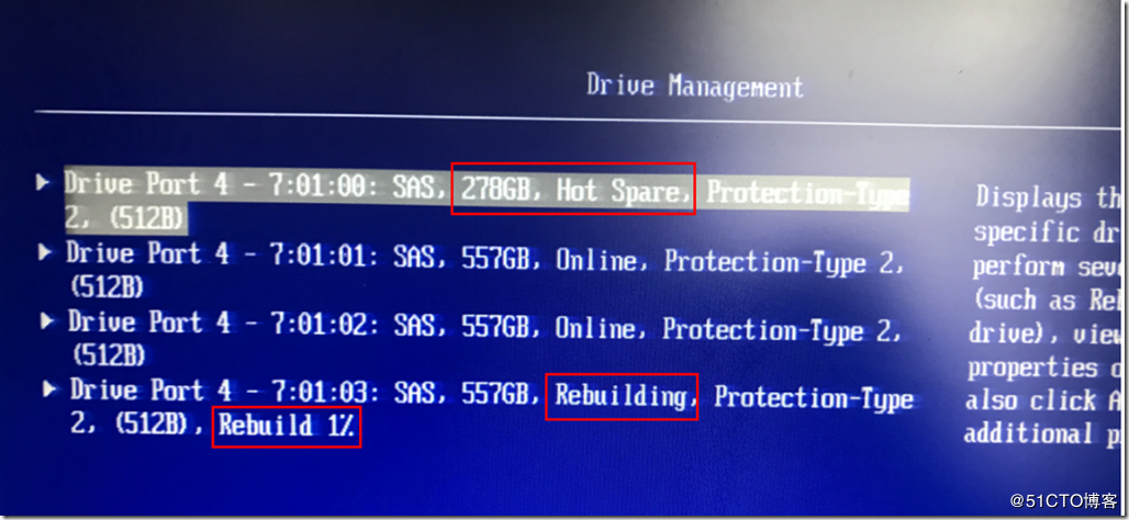 另外一台服务器只坏了一块硬盘,换上硬盘之后数据开始同步。因为看到的第1台服务器RAID配置不合适,我重新启动服务器进入RAID卡配置模块,果然这块300GB的硬盘也被配置成了热备磁盘,如图5所示。同时新换上的硬盘已经开始重组数据。