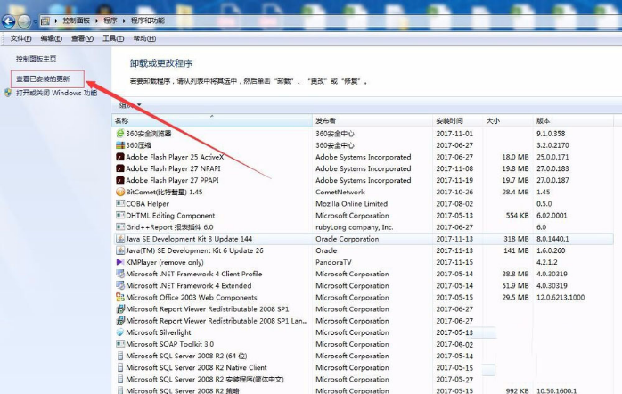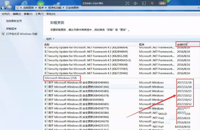 找到Microsoft Windows,顶部以安装时间进行排序(默认即可),找到最接近于现在日期更新的程序(确切的讲,是找到打印机突然不能打印的那个日期更新的微软程序)。