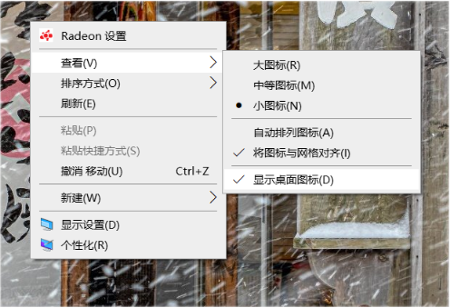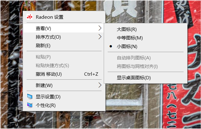 击鼠标右键,如图所示。点击查看,发现显示桌面图标前面的勾没有了,