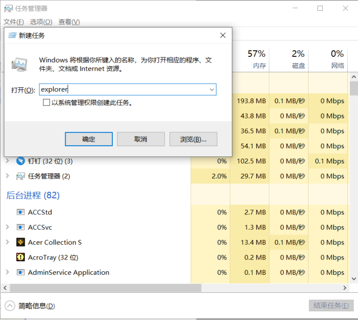 在出现的对话框中输入explorer,点击确定,稍等一下就会出现桌面图标了。