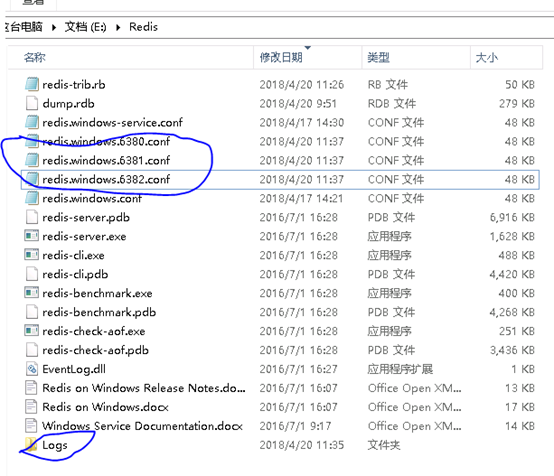在Redis目录E:/Redis下新建Logs文件夹,并且创建3个端口下的配置文件,记得修改里面的接口