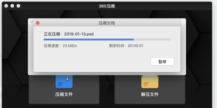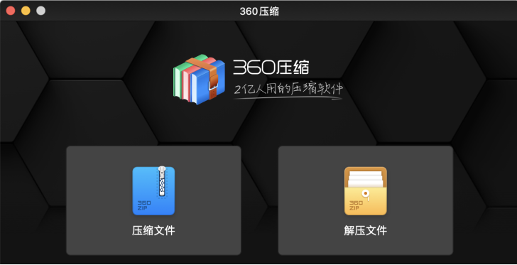 360压缩macOS版主界面非常简洁,仅有“压缩文件”和“解压文件”两个按钮,经实测,360压缩macOS版压缩/解压速度较快,操作简单,支持拖拽文件。