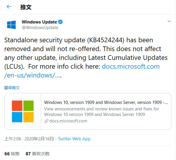微软承认Windows 10 KB4524244存在问题,现已撤回并暂停分发