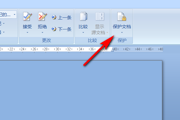 3、进入之后,在审阅下面有有个保护文档的选项,找到并点击它。