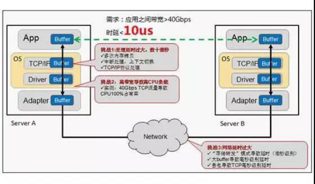 面对高性能计算、大数据分析和浪涌型IO高并发、低时延应用,现有TCP/IP软硬件架构和应用高CPU消耗的技术特征根本不能满足应用的需求。这要有体现在处理延时过大,数十微秒;多次内存拷贝、中断处理,上下文切换、复杂的TCP/IP协议处理、网络延时过大、存储转发模式和丢包导致额外延时