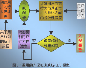 图2是一个不依赖于特殊的系统、应用环境、系统缺陷和入侵类型的通用型IDS模型。其基本思路为:入侵者的行为和合法用户的异常行为是可以从合法用户的正常行为中区别出来的。为定义用户的正常行为就必须为该用户建立和维护一系列的行为轮廓配置,这些配置描述了用户正常使用系统的行为特征。IDS可以利用这些配置来监控当前用户活动并与以前的用户活动进行比较,当一个用户的当前活动与以往活动的差别超出了轮廓配置各项的门限值时,这个当前活动就被认为是异常的并且它很可能就是一个入侵行为。