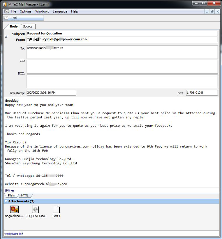 在精心构造的社工邮件内容中,攻击者伪装为企业员工,催促邮件接收者尽快检查附件内容并回复。为提高可信度,邮件中声称该因为受新冠肺炎疫情影响,该公司将放假延长到2月9日,并延期至2月10日复工(Because of the infflience of coronavirus, our holiday has been extended to 9th Feb, we will return to work fully on the 10th Feb)。从邮件内容来看,攻击者对疫情时事较为了解,可能是有组织的黑客团体。