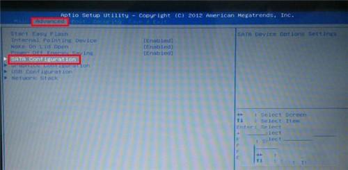 将光标移动到“Advanced”选项卡,然后再按上下方向键选择“SATA Configuration”,按回车键确认。