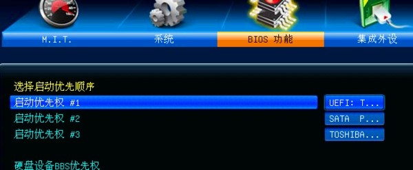 2、进入BIOS设置界面后,点击BIOS功能选项,并在下方列表中选中启动优先权#1,按下回车键进入启动顺序设置。