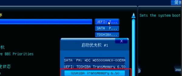 3、在启动顺序选点击识别到的U盘,按下回车即可把U盘设置为第一启动项。