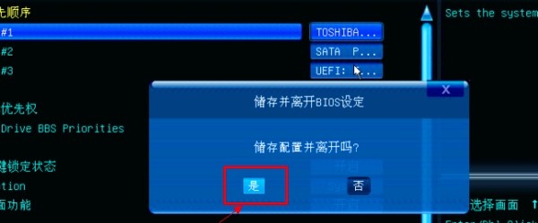 5、设置好启动顺序后,按下F10进行保存设置,会弹出是否储存配置并离开的询问对话框,点击是即可,电脑则会自动重启。