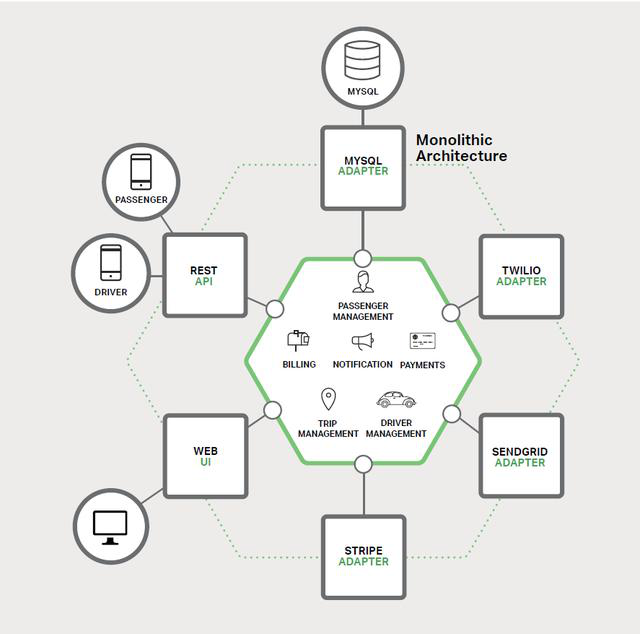 在架构核心,设计了乘客管理,司机管理。行程管理,支付,消息通知等核心模块。围绕核心模块,我们再设计各种接口适配器,如同数据库对接,同移动端的api接口,web页面,对其他外部组织对接接口等等。然后我们就可以打成一个包,进行部署。在项目的早期,这没有太大问题。我们还可以通过负载均衡器在做多个实例的负载均衡。