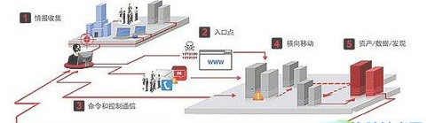 整个APT攻击过程包括定向情报收集、单点攻击突破、控制通道构建、内部横向渗透和数据收集上传等步骤:
