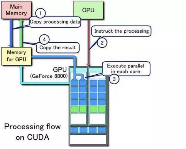 在需要GPU进行运算时,以NVIDIA推出的CUDA(Compute Unified Device Architecture)为例,整体的原理如下: