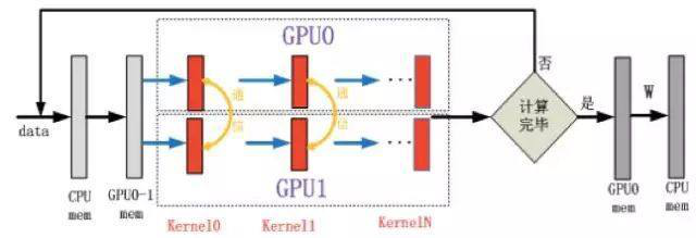 针对每次训练数据,模型内计算通过多次GPU 内核的调用完成计算。权重W值一直存在GPU内存中,直到所有训练数据计算完毕之后回传到系统内存中。
