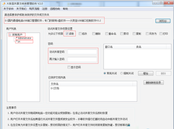 1、下载安装大势至共享文件夹管理软件,选择你要共享的文件夹,点击保护就可以共享文件了。