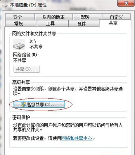 5、右键打开你要共享的文件夹所在磁盘,打开磁盘属性,选择共享的选项,再点击高级共享。