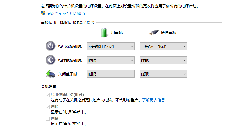 到了这个页面就相当于成功了,这个里面有调整电源按键的选项,我这里是选的不起任何作用,还有一些人喜欢休眠之类的!