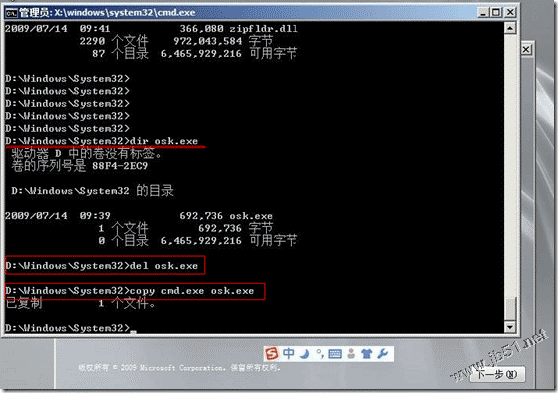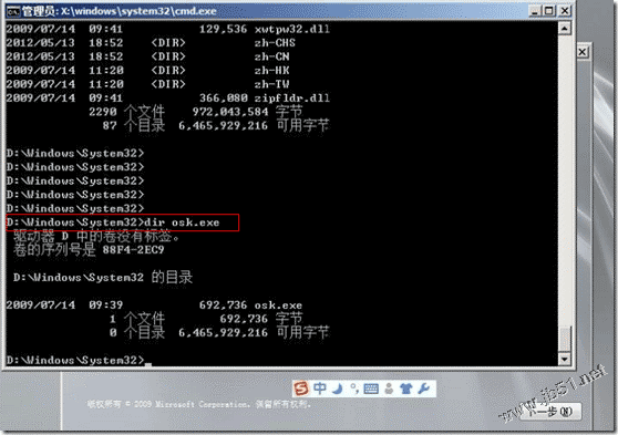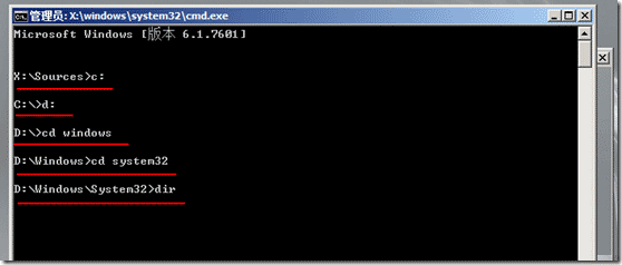 一、使用Windows Server 2008 R2的安装光盘引导计算机启动。完成安装映像加载后,进入语言选择界面,此时,按下“Shift+F10”,打开命令提示符界面,进入Windows目录所在分区(若是默认安装Windows,并使用的“系统保留”分区,则为D盘),并定为到“Windows\System32”目录下