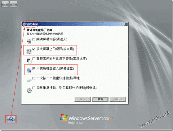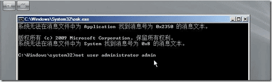 重启计算机,等待开机启动完毕,点击左下角的“轻松访问”按钮,在弹出对话框中勾选“不使用键盘键入,在MCD命令提示符中输入如下: net user administrator admin