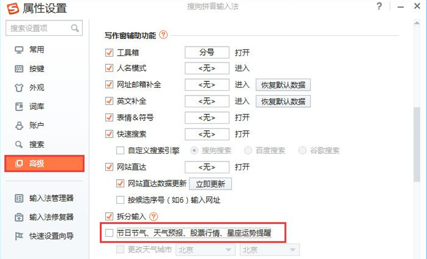 3、在左侧点击【高级】,在右侧移动到底部,将【开启节日节气提醒、天气预报、股票行情以及星座运势提醒】的勾去掉,点击应用确定即可。