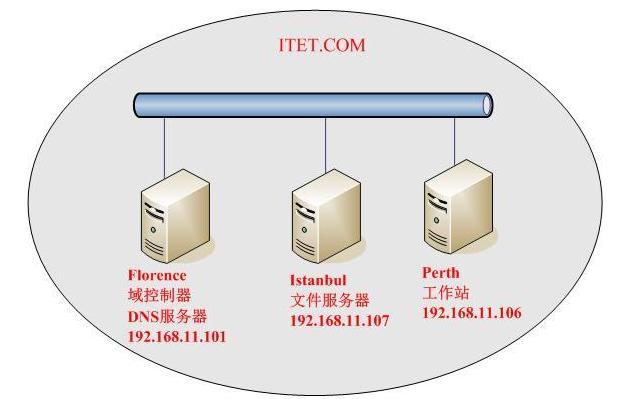 今天我们将通过一个实例为大家介绍如何通过组策略进行软件部署,拓扑如下图所示,Florence是域控制器,Istanbul是文件服务器,Perth是测试用的客户机。