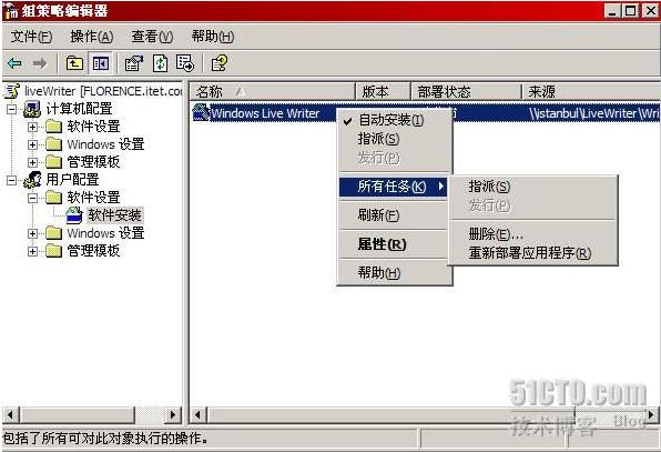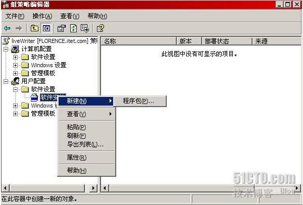 如图4所示,编辑新创建的LiveWriter组策略属性,准备在组策略中设置软件安装。组策略可以针对用户或计算机进行软件安装设置,本例中我们将针对用户。在组策略中定位到用户配置-软件设置-软件安装,选择新建一个程序包。