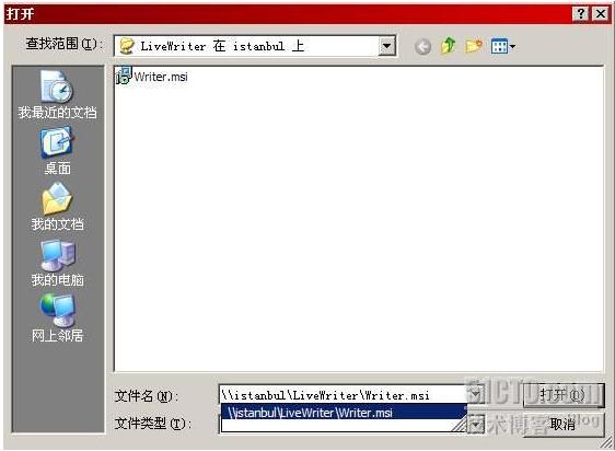 首先,我们要准备测试用的软件。我们准备的软件是微软的LiveWriter,这个软件想必各位博友是非常熟悉的,非常著名的离线博客工具。如图1所示,我们把LiveWriter存储在istanbul的一个共享文件夹中,大家可以看到程序的扩展名是MSI。