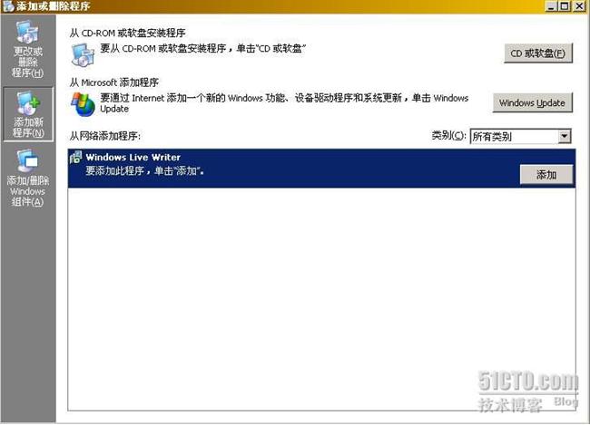 组策略设置完毕后,我们在客户机Perth上测试一下。由于此次组策略软件安装针对的是用户,因此我们需要让张建国用户注销后重新登录,这样策略才能生效。如图8所示,张建国登录后打开控制面板中的添加或删除程序,点击“添加新程序”,就可以看到有一个Windows Live Writer程序可供选择,点击“添加”就可以开始安装了。