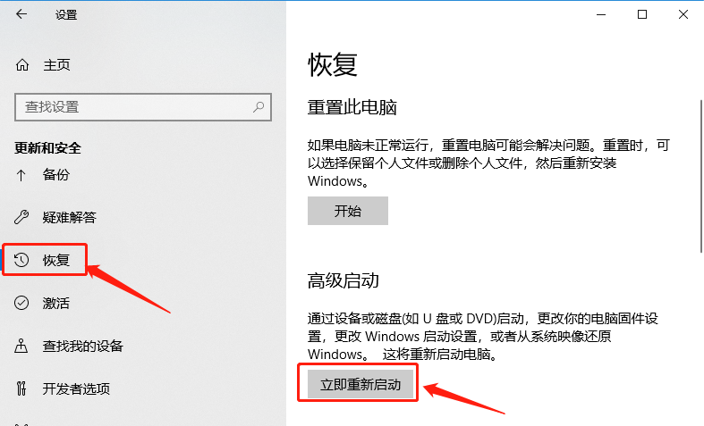 2。选择[还原]菜单,然后单击“高级启动”下的[立即重新启动]。