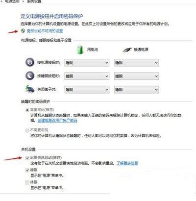 4、此时,下方的关机设置为不可更改状态,我们点击上方的更改当前不可用的设置