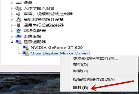 4、在设备管理器中可以看到电脑中所有设备的状态,将鼠标向下拉动,找到显示适配器选项,并在显示适配器中找到对应的显卡驱动,右键点击然后选择属性。