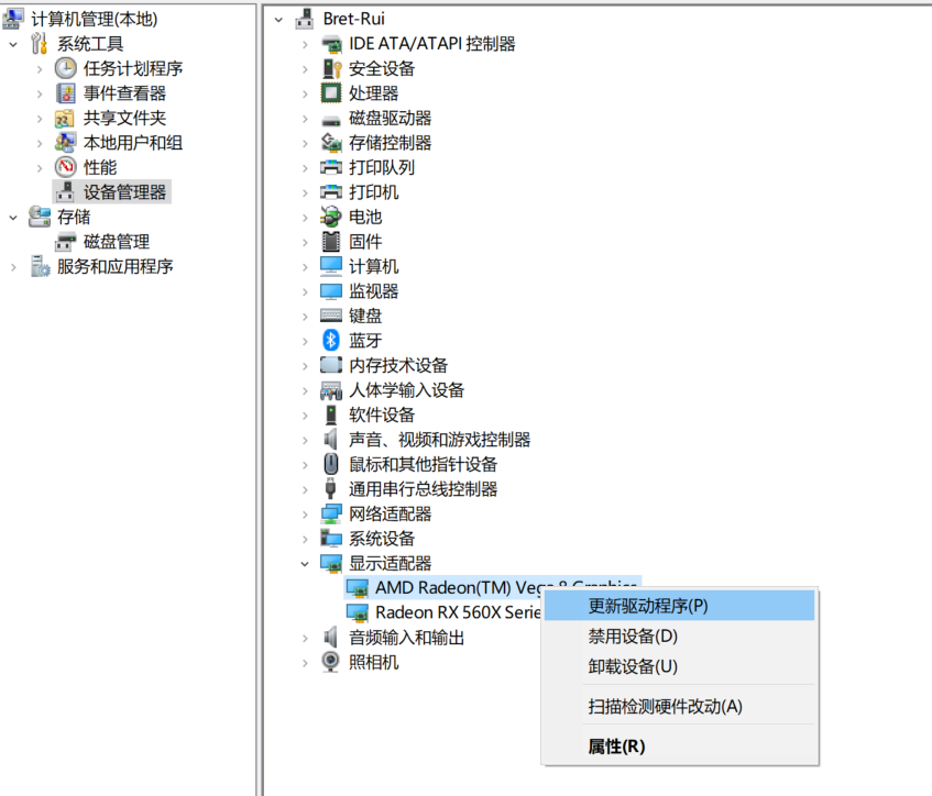 进入计算机管理界面,点击【设备管理器】——【显示适配器】,鼠标右击适配器上,点击【更新驱动程序软件】。