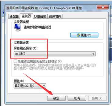 进入属性界面,切换至【监视器】页面,然后点击【监视器设置】——【屏幕刷新频率】,进行调整,最后点击确定。