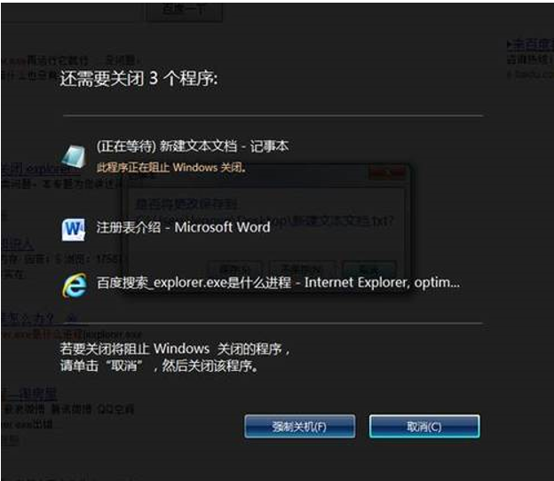 对于处理这种问题,如果确认列表中的程序还没有保存工作内容,需要迅速点击“取消(C)”按钮,保存工作内容后再关机,否则系统等待一定时间后会自动结束并关闭计算机。当然,如果确认工作内容已经保存,也可以直接点击“强制关机(F)”按钮实现关机。