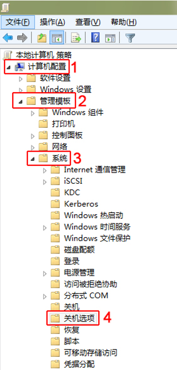 2、在弹出的组策略编辑器窗口,展开“计算机配置”---“管理模板”---“系统”---“关机选项”。如下图所示: