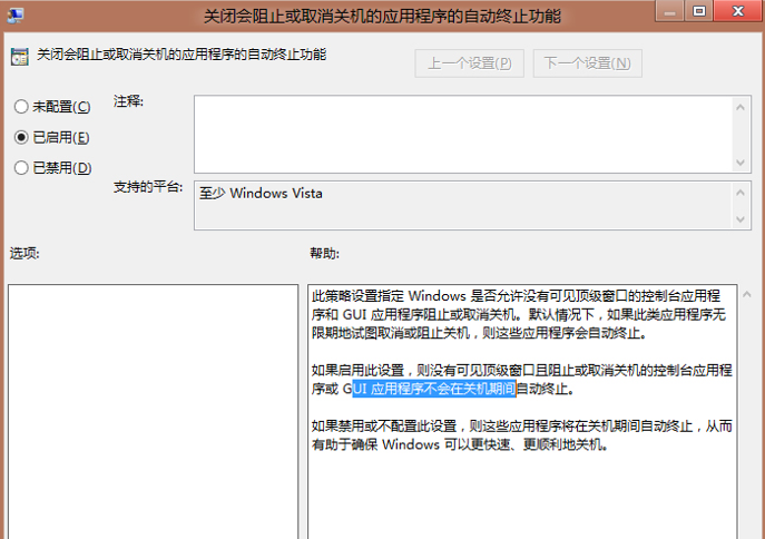4、根据实际情况,选择对应的设置。如“已启用(E)”表示不允许自动强制关机,需要用户手动选择确认。如下图所示: