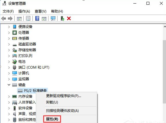 2、在设备管理器中展开【键盘】,在键盘下面的【PS/2 标准键盘】上单击鼠标右键,选择【属性】;