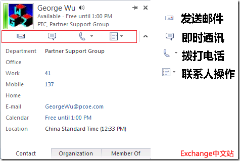Exchange 2010 开始,Microsoft开始使用“联系人卡片”功能,来进行统一通讯平台中,用户信息的整合。通过这一功能,用户可以方便地对联系人进行操作。包括查看联系信息,组织单位,闲忙状态,即时通讯的在线状态,并且进行邮件联系或即时通讯等。