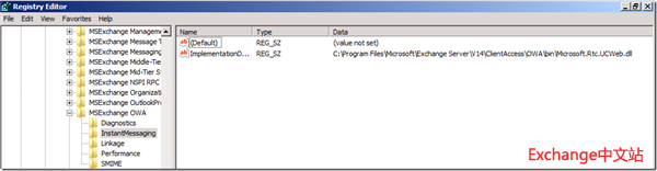 安装结束后,检查CAS服务器的注册表:HKLM\System\CurrentControlSet\services\MSExchange Owa\InstantMessaging\ImplementationDllPath,这个值应该指向一个DLL文件,该DLL文件就是Lync的Web Service Provider。