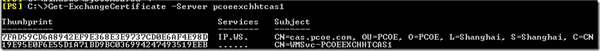 在Exchange CAS服务器上,运行命令Get-ExchangeCertificate,获取当前使用的服务器证书。并且定位到IIS站点所绑定的服务器证书,复制出该证书的指纹。