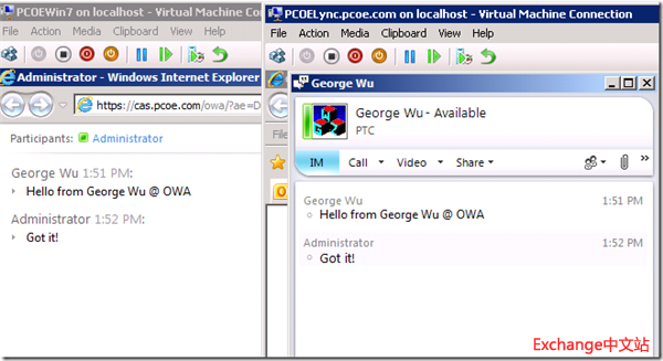 4、如果当前登录OWA的机器安装有Lync客户端,Lync客户端会被启动;如果没有,即时通讯将在IE中进行。