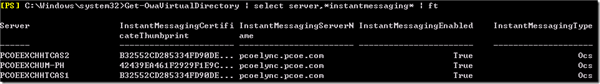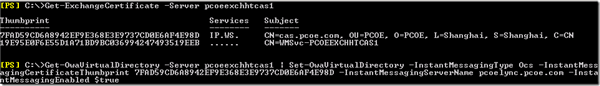 Get-OwaVirtualDirectory -Server pcoeexchhtcas1 | Set-OwaVirtualDirectory -InstantMessagingType Ocs -InstantMessagingCertificateThumbprint 7FAD59CD6A8942EF9E368E3E9737CD0E6AF4E98D -InstantMessagingServerName pcoelync.pcoe.com -InstantMessagingEnabled $true