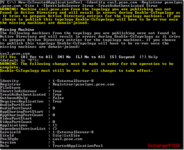 New-CsTrustedApplicationPool -Identity cas3.pcoe.com –Registrar pcoelync.pcoe.com -Site 1 -ThrottleAsServer $true -TreatAsAuthenticated $true