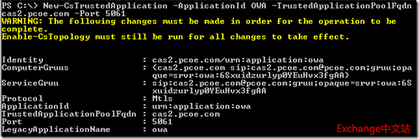 New-CsTrustedApplication -ApplicationId OWA -TrustedApplicationPoolFqdn cas2.pcoe.com -Port 5061