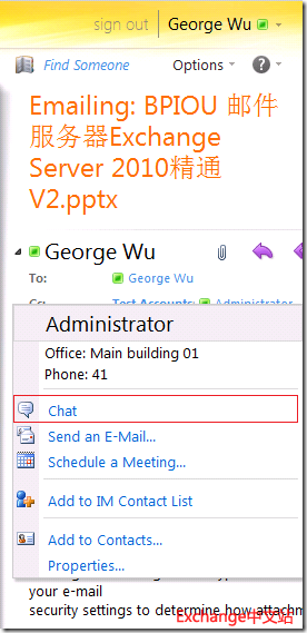 这是Outlook客户端的情况,要求用户在机器上安装有Outlook和Lync客户端。那么在一个公用计算机,没有安装这些客户端软件,只能使用IE浏览器的情况下,如何使用这些功能呢?这就体现出“统一沟通”平台的优势了。Microsoft提供了Exchange OWA与Lync Server的集成使用方式,使用户可以在只有IE的情况下,也能够使用这些功能。