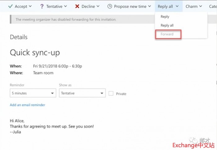 第二,在新建会议的时候,禁止与会者转发会议。这个功能我觉得还不错,至少可以避免一个六人的会议室涌进20多个人,组织者还一脸懵逼的情况。