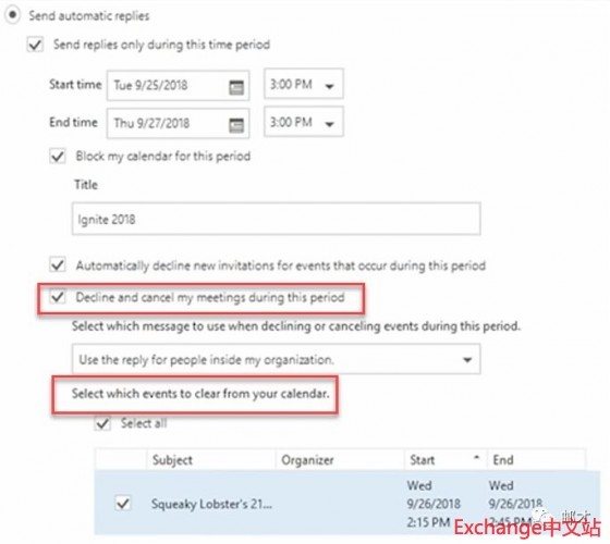 第三,是自动回复的改进。我们在休假期间通常会设置自动回复,这次在OWA中,我们甚至可以在休假期间自动拒绝所有的会议要求,并且,在开启自动回复时间段的时候,选择是否清空该时间段内的所有会议安排。